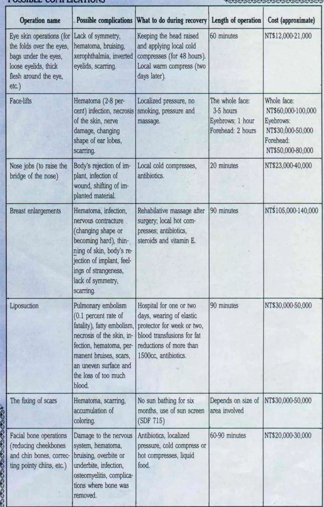 卅出頭,在某大企業中任職秘書的林小姐,就曾花了五、六萬元去大醫院做大腿內側的抽脂手術。在這種「穿短裙也看不到」的部位大費周章,為的也只是「讓自己感覺起來舒服一點」;廿六歲的周小姐,則是在做過兩次改善「招風耳」的手術後,接著做了一次「輕微的」隆鼻手術,輕微的程度連家人、朋友都看不出來。但她仍舊很高興,「只要我自己知道鼻型有改善就好了」,她說:「又不是做新髮型、新衣服,要到處向別人炫耀!」