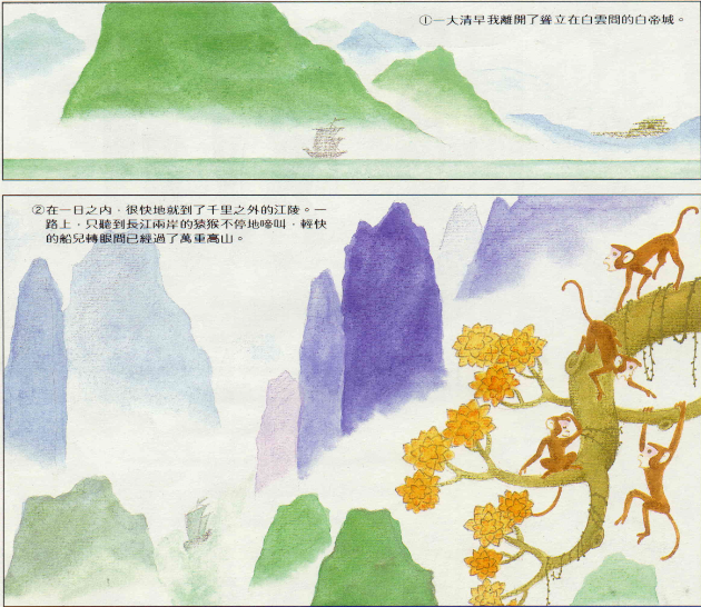下江陵 文‧洪義男 圖‧洪義男 1988 7月 EN 分享: 朝辭白帝彩雲間,千里江陵一日還。 兩岸猿聲啼不住,輕舟已過萬重山。 ——李白(西元701∼762) 1.一大清早我離開了聳立在白雲間的白帝城。 2.在一日之內,很快地就到了千里之外的江陵。一路上,只聽到長江兩岸的猿猴不停地啼叫,輕快的船兒轉眼間已經過了萬重高山。 分享: