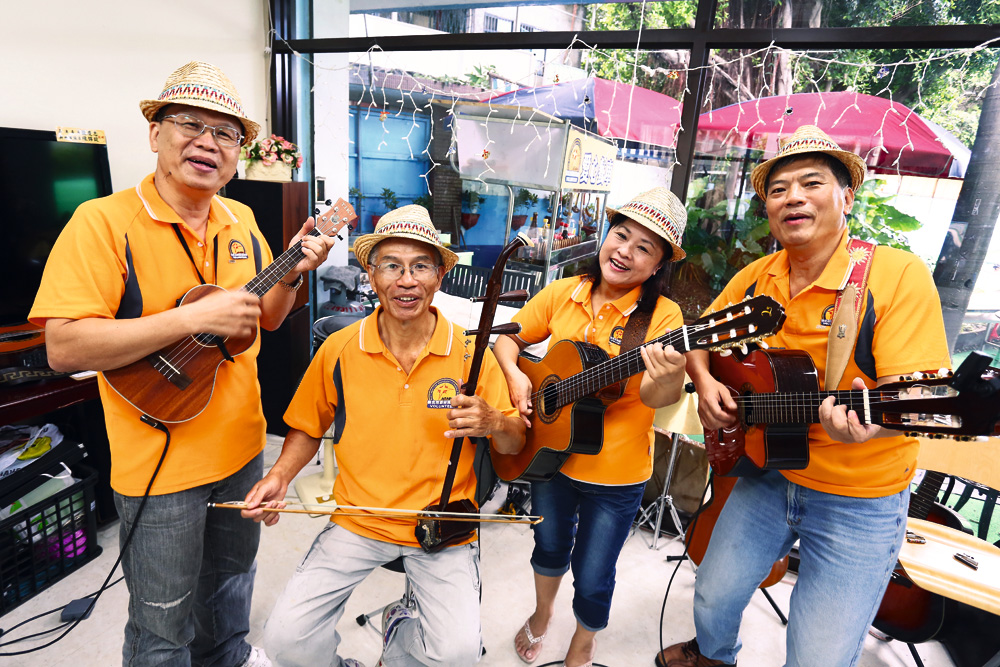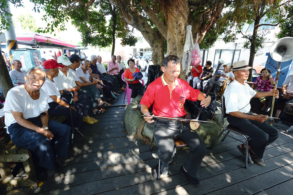 音樂、舞蹈,可自娛,也能娛人,為老年生活增添不少風情與樂趣。上圖為新北市銀髮族協會的「佈老樂團」,下圖為北埔假日唱山歌活動。