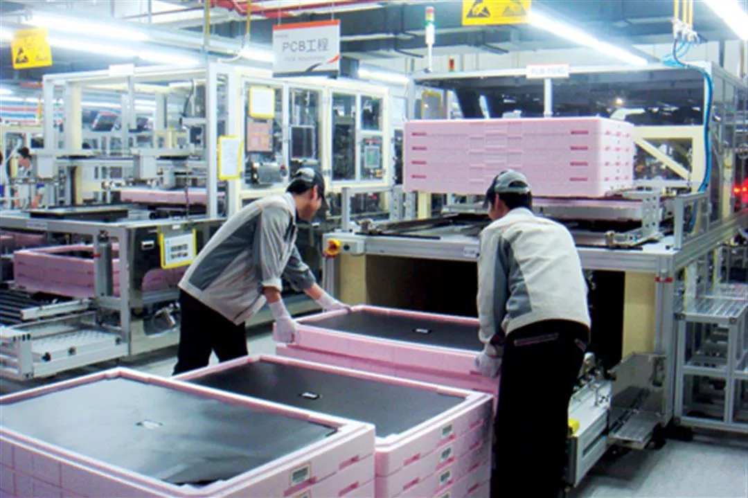 瑞軒科技的電視產線已外移至與韓國LG Display合組的蘇州樂軒科技,圖為正在進行機台後段組裝的工人們。