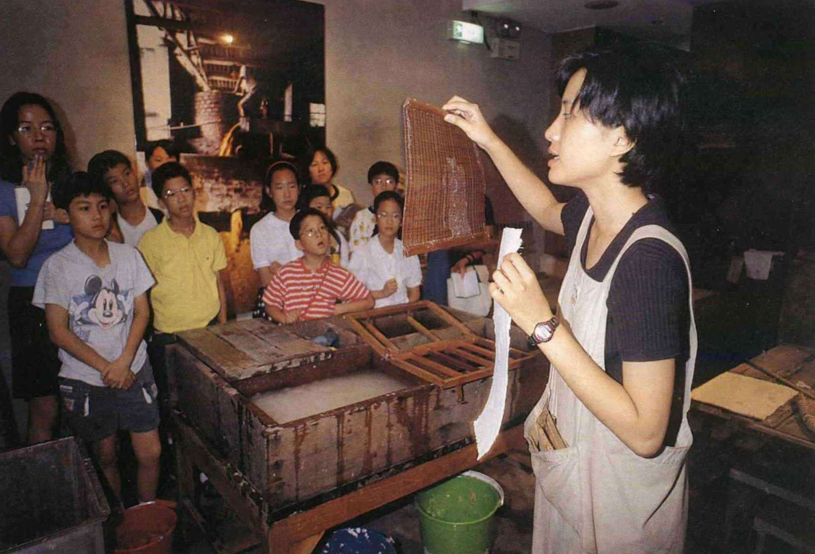 「小朋友,你們猜工作人員手上的抄簾有多重?」示範過程中解說員與小朋友一問一答,「不對,不對,答案是沒下水之前重三到五公斤,相當一個小嬰兒;然而一入了水卻變成二十五到三十公斤重,差不多是一個一年級小朋友的體重。一個師傅一天要將抄簾放入水中一千五百次左右。」