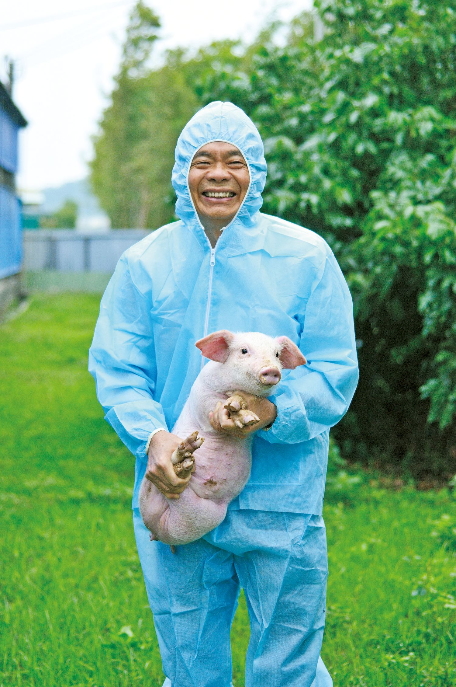 劉天和堪稱是全方位的科技 神農, 圖為餵食魚雜及褐 藻做成有機飼料的海藻豬。 (天和鮮物提供)