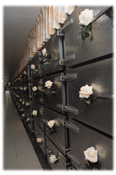 (左圖)一朵小小的白玫瑰,讓生硬的冷凍櫃溫暖了許多。台北市第二殯儀館在禮堂布置、移靈走廊都作了全新的布置,一改殯儀館過去恐怖陳舊的模樣。