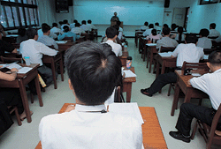 教室內,來自傳統殯葬業家族的學員,大多是高上學歷的第二代,還有一家大型殯葬業者帶了十三名禮儀師前來,一律穿著襯衫、西裝褲,令人耳目一新。大家專心聽課、振筆疾飛地作筆記,一旁還擺了錄音機,以免有所遺漏。期末還要考試和交三千字以上的報告,才能取得證書。