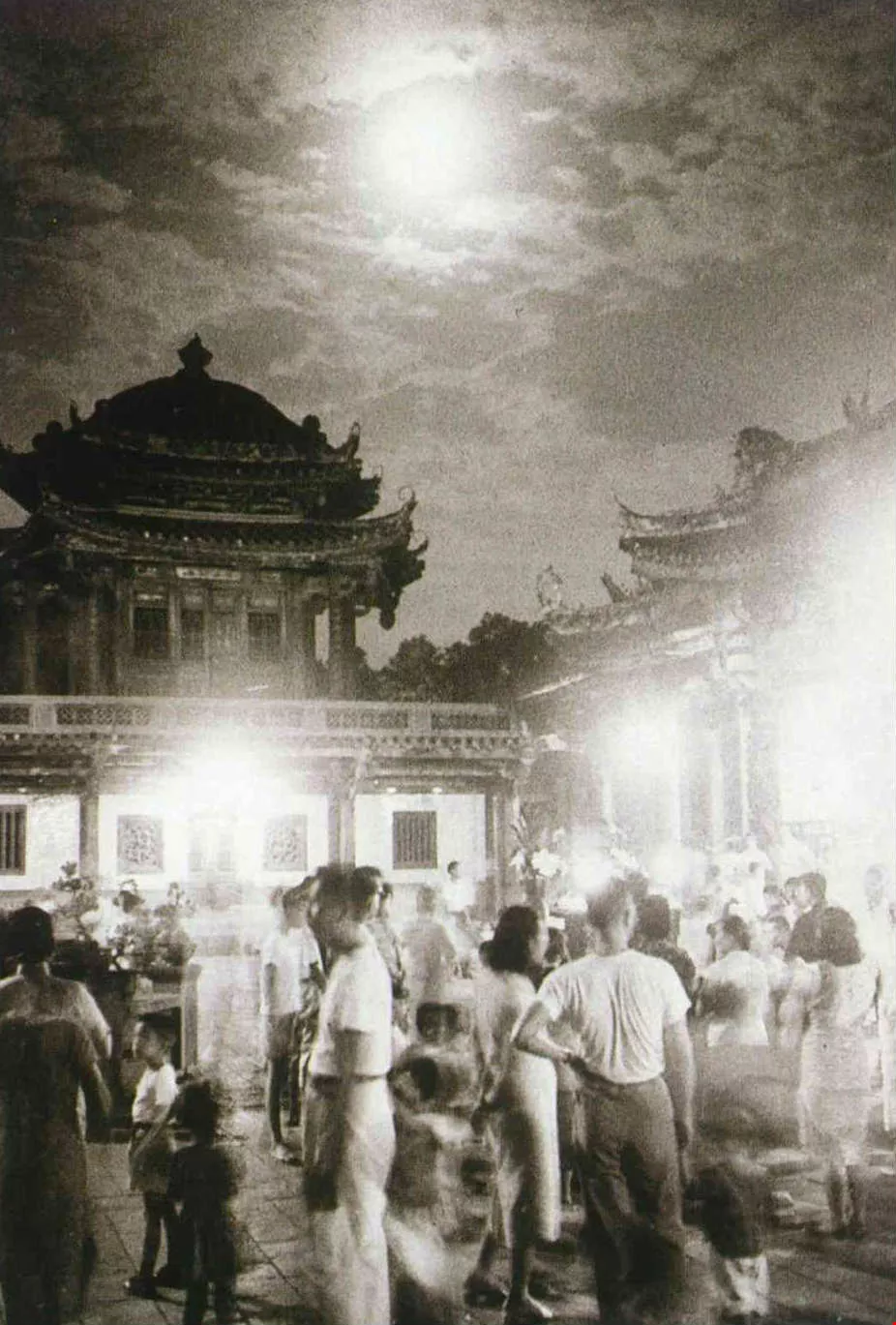 黃則修所使用的軟片,當時只有一百度的Double X ,在光源不足的情況下,他將軟片當成兩千度使用,用D—76加沖。因而我們在正殿廣場前的夜色中,看到雲層穿行的月光、恍惚遊走的人影、以及明暗起落的佈局構成,更增加了照片鮮活、曖昧的氣氛。