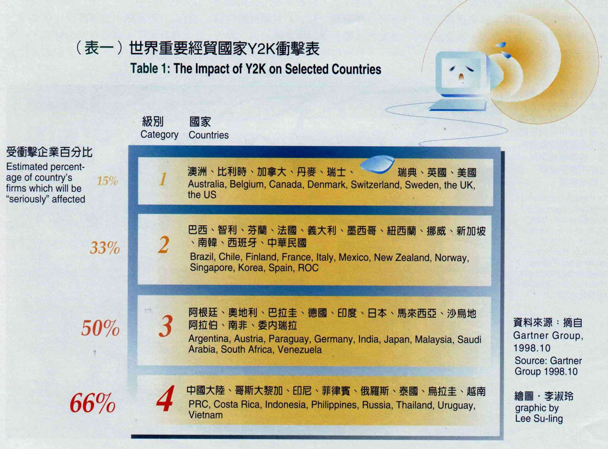 根據世界著名經濟機構 Gartner Group 對全球八十多個主要經濟國的評估,Y2K的因應進度可分為四級(表一)。A級國家儘管進度領先,但估計仍有百分之十五 的企業會在千禧蟲攻擊下遭受衝擊;這個比例在B級驟升一倍,達到三分之一,包括台、韓、星等小龍都屬於這一級。C級有一半的企業將慘遭重擊;至於第四級,受衝擊比例更高達 三分之二。