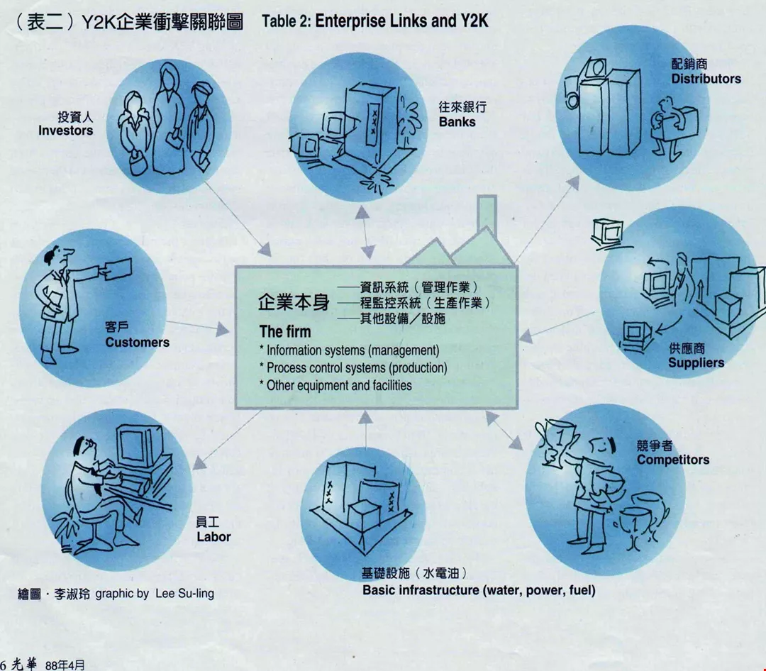 放寬視野,企業所處國家的水、電、交通、關務等基礎建設合不合格?上游的原物料供應商、各零件衛星工廠及協力廠,還有下游的重要客戶、經銷體系、物流體系……,每一個環節都可以安然過渡到西元二千年嗎?如果不能,對企業會造成哪些衝擊?這些都是需納入考慮的變數。