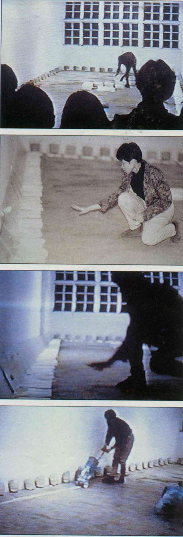 行動藝術一九九一(湯皇珍提供)在七十二塊工業性的壓克力板背後,擺置同數的瓦楞紙袋,以同數「生物性」的雞蛋向壓克力板丟去,雞蛋沒有回到原本裝它的紙袋,而破在壓克力板上。之後,在作品邊畫上白線,請觀眾自由進入。探討「界線」問題。