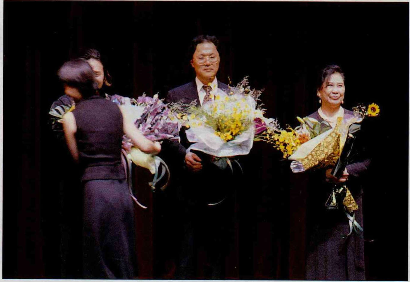一手創辦「北美菁英」的汪大衛在演出後接受獻花。看來百感交集的他,是太累了,還是在想,我們終於又往前挪了一大步?(卜華志)