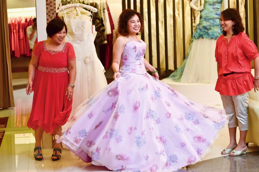 不過,由於台灣的婚紗攝影產業非常蓬勃,為了拍攝美美的婚紗照,留下一生最美好的回憶,多數新人仍會選擇「禮服租用+拍照」的包套服務,自購白紗的比例偏低。反倒是晚禮服在眾多貴婦及媽媽們的口耳行銷下,業績日益成長,每月平均可賣出上百件。