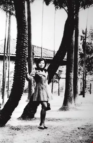聰慧傑出、看似無憂的少女,其實內心背負著沈沈心事,不知向誰訴說。此圖攝於1971年台大傅鐘前。