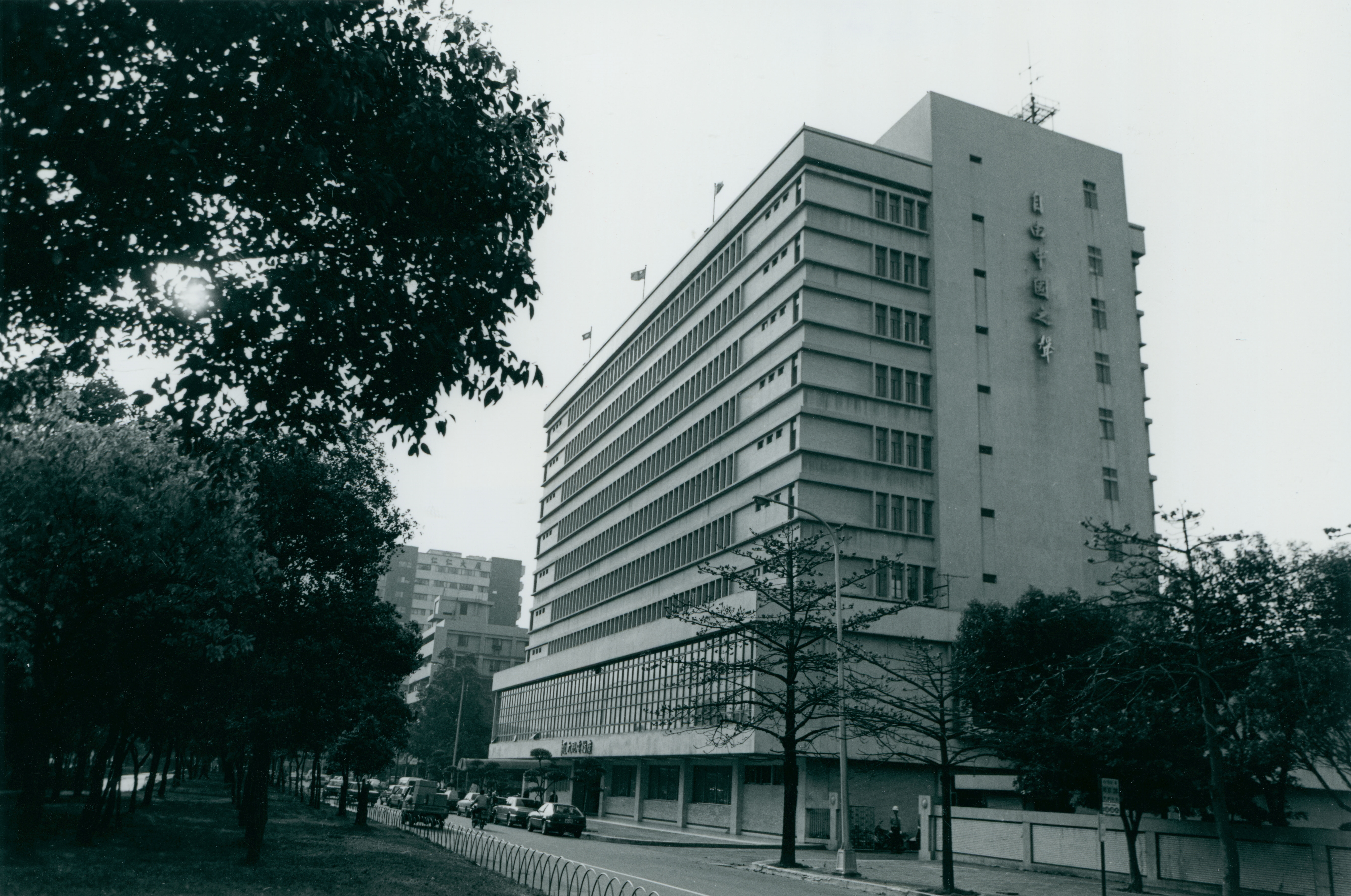 圖1.:在台北市仁愛路上,遠遠即可看見中廣的廣播電視大樓上「自由中國之聲」幾個大字。