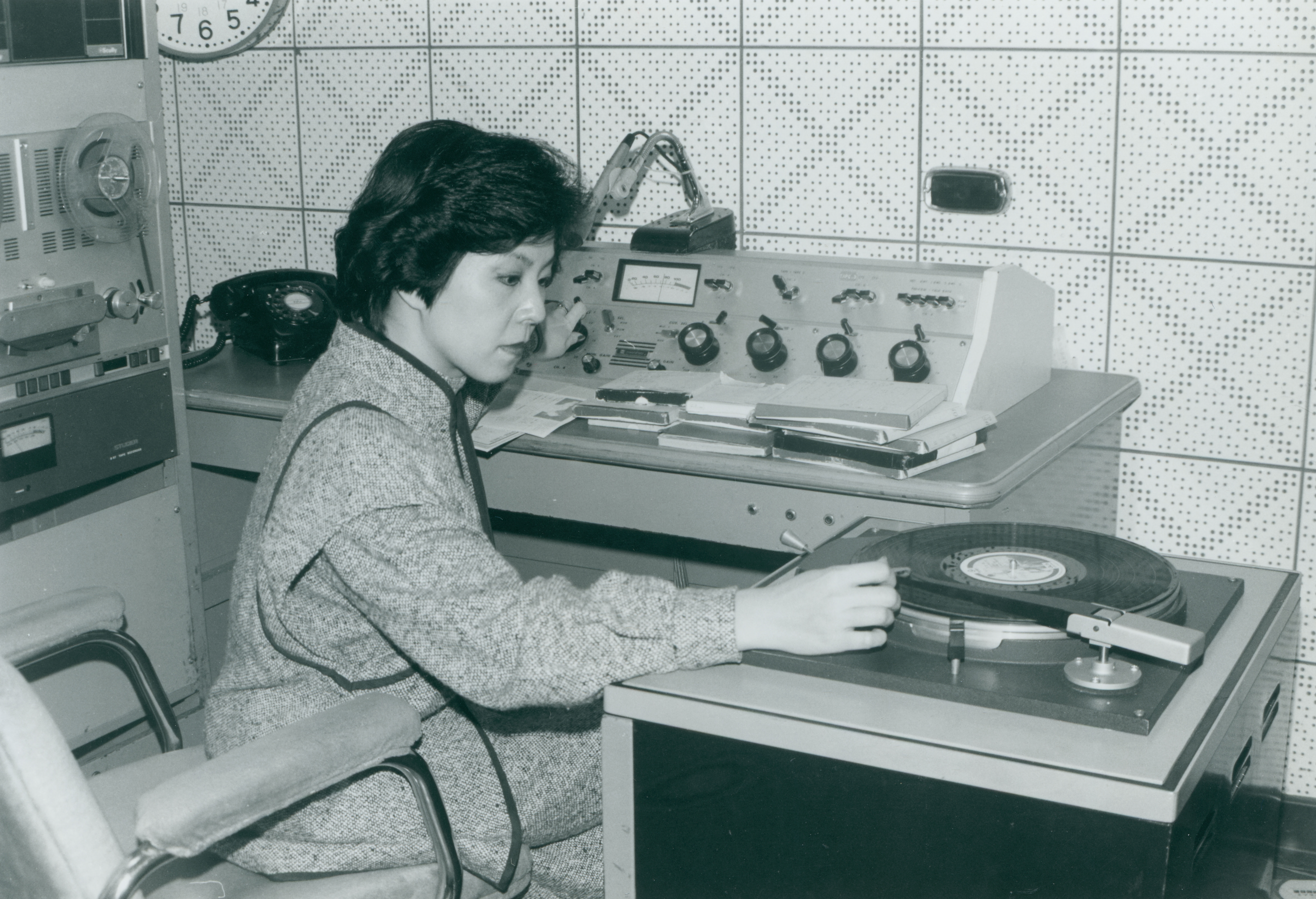 圖2.:節目錄製時,主持人除了口到耳到,還要手到。一手放唱片,一手控制音量大小。(郭娟秋)