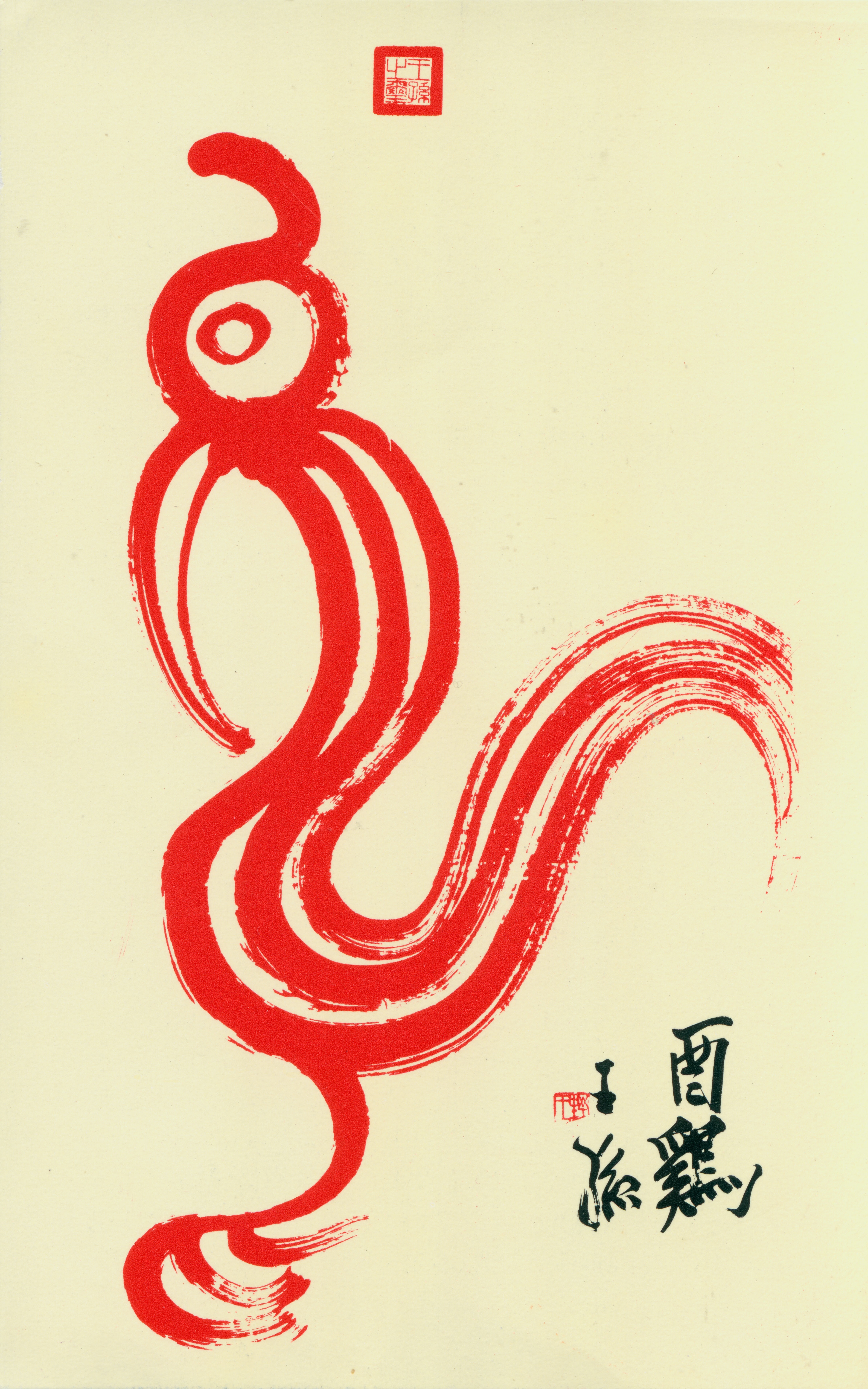 圖1.:金石家王王孫先生為自由中國之聲設計了一套十二生肖的收聽卡,圖為「雞」之象形書法。(郭娟秋)