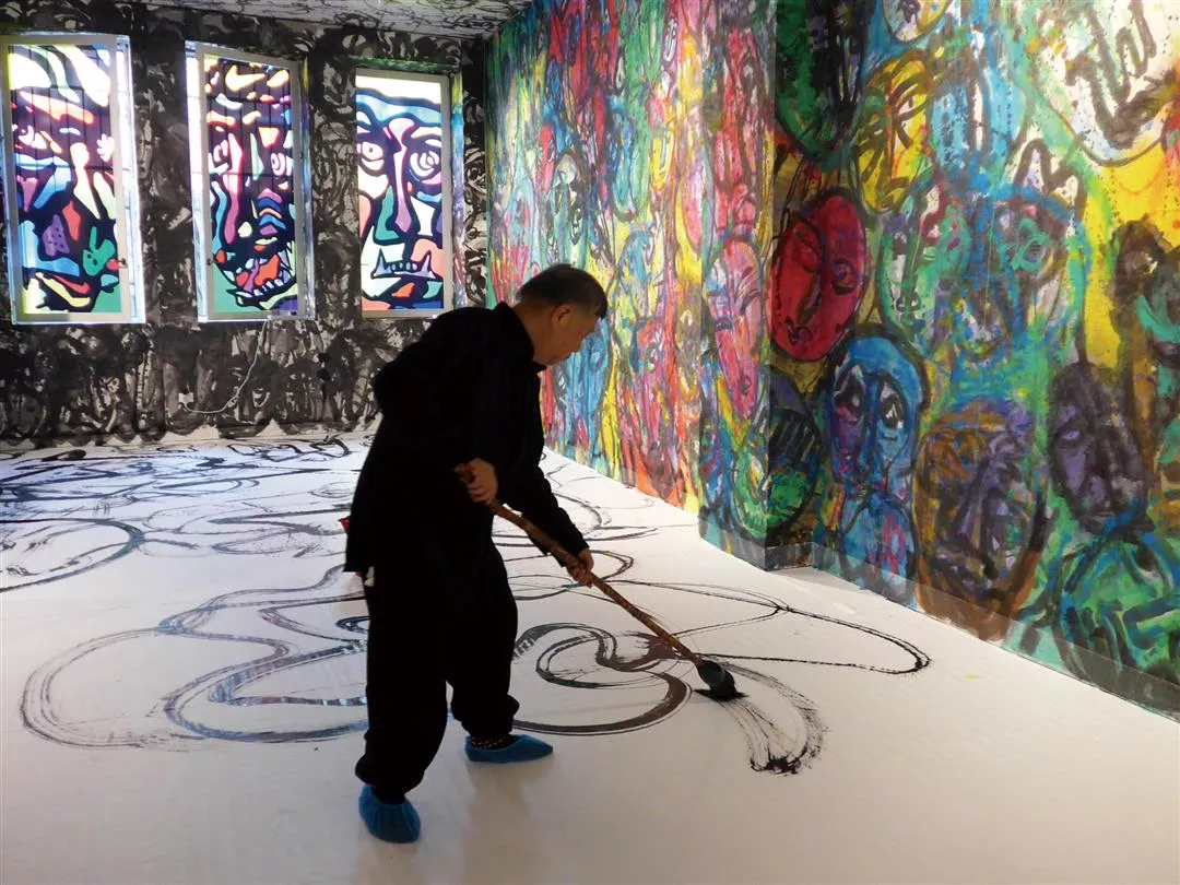 2015年威尼斯雙年展,張耀煌以「蒼生問」為主題,在展覽現場揮毫創作,天花板、牆壁、窗戶和地板,整個空間充滿視覺張力的畫作,驚豔國際藝壇。(張耀煌提供)