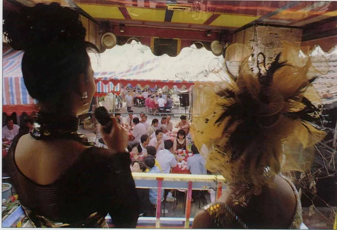十個藝人,一個人三首歌,慢中快,隨著音樂加快,衣服則一件一件減少,群眾也越擠越近,有的乾脆爬上戲台,把戲台壓垮的例子也曾發生過。極盛時期,為了拚場,小姐們往往都不唱了,一上場就脫。