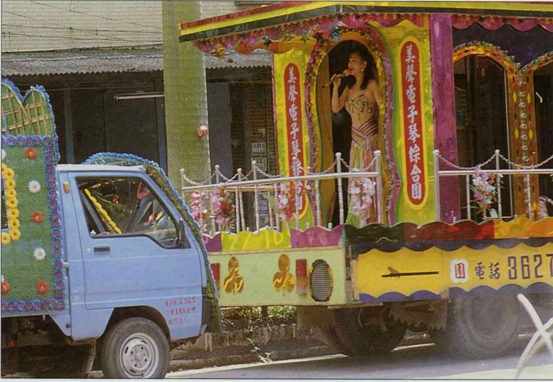 每逢廟會,總會看到綠油油的稻田旁有那麼一種奇異的隊伍:五光十色的花車後,跟著三三兩兩騎著腳踏車的老先生或騎著摩托車的少年家,彷彿被下了魔咒般,眼睛直盯著「有穿和沒穿差不多」的女郎又跳又扭。電子琴花車的女郎也會大方地招徠群眾,笑著說「來來來,老人看了吃百二,嬰孩看了好養食」。
