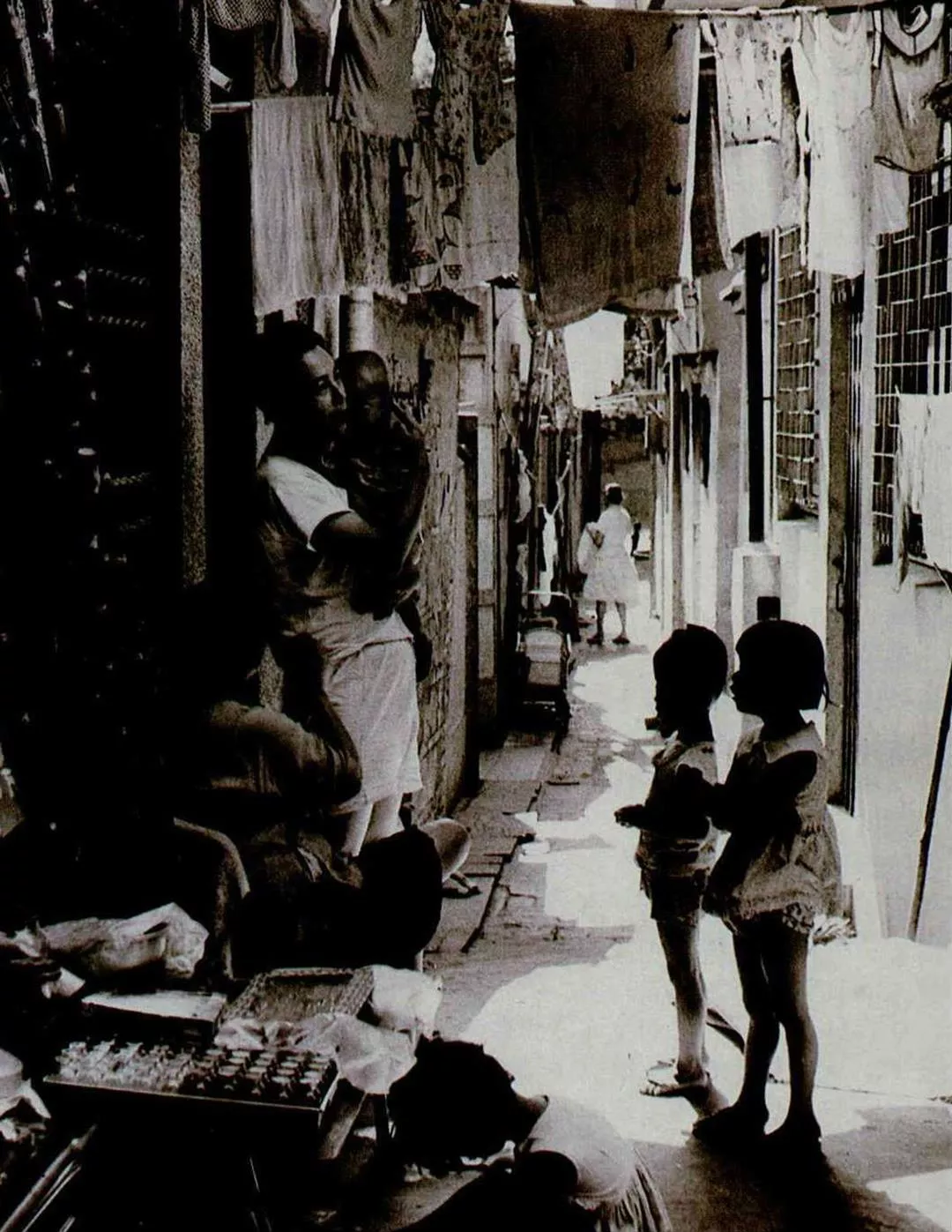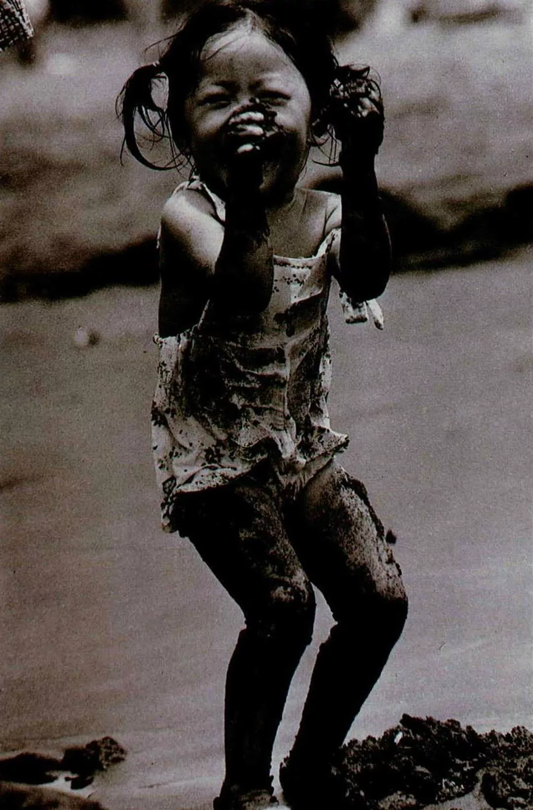 在「嬉戲」(一九六二年)與「後街生活」(一九六一年)中,我們看到孩童與家居生活的憶往。那滿身泥沙的小女孩舉起雙手面對鏡頭嘻笑時,右手正好擋住臉中央,傳統的看法會認為是個瑕疵,然而久瞪那樣一張臉,卻也可以讀出另一種猜測與想像的趣味。「後街生活」中幾個人物均勻散佈在紛雜的巷道環境裡,亂中有序,而抱著哭啼幼子的父親顏臉和倚鄰而坐的老婦人安撫手勢,正是「後街生活」的情緒重心所在。
