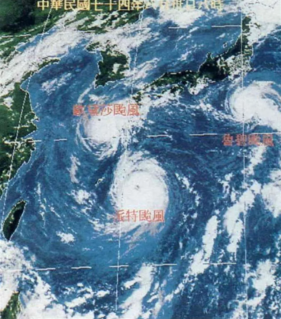 八月卅日,西太平洋的三個颱風連袂而來,氣象衛星拍下了這張「三足鼎立」的寶貴照片。(張良綱)