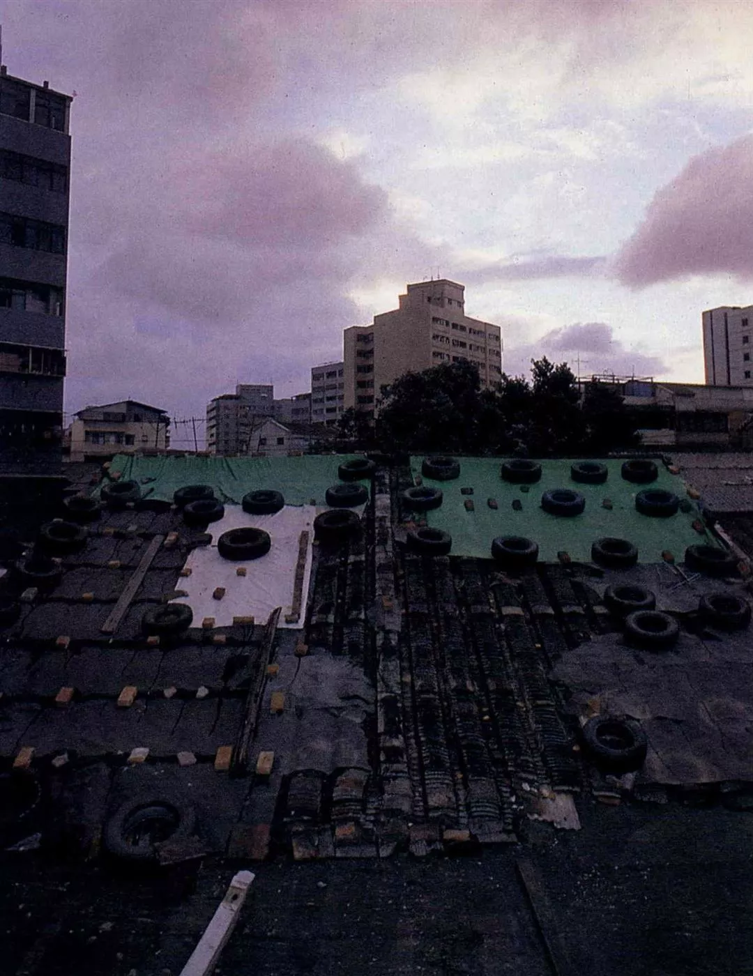 颱風剛過,天色依然詭異;在暴風雨時鎮壓瓦片的車胎,也有些早已自身不保。(張良綱)