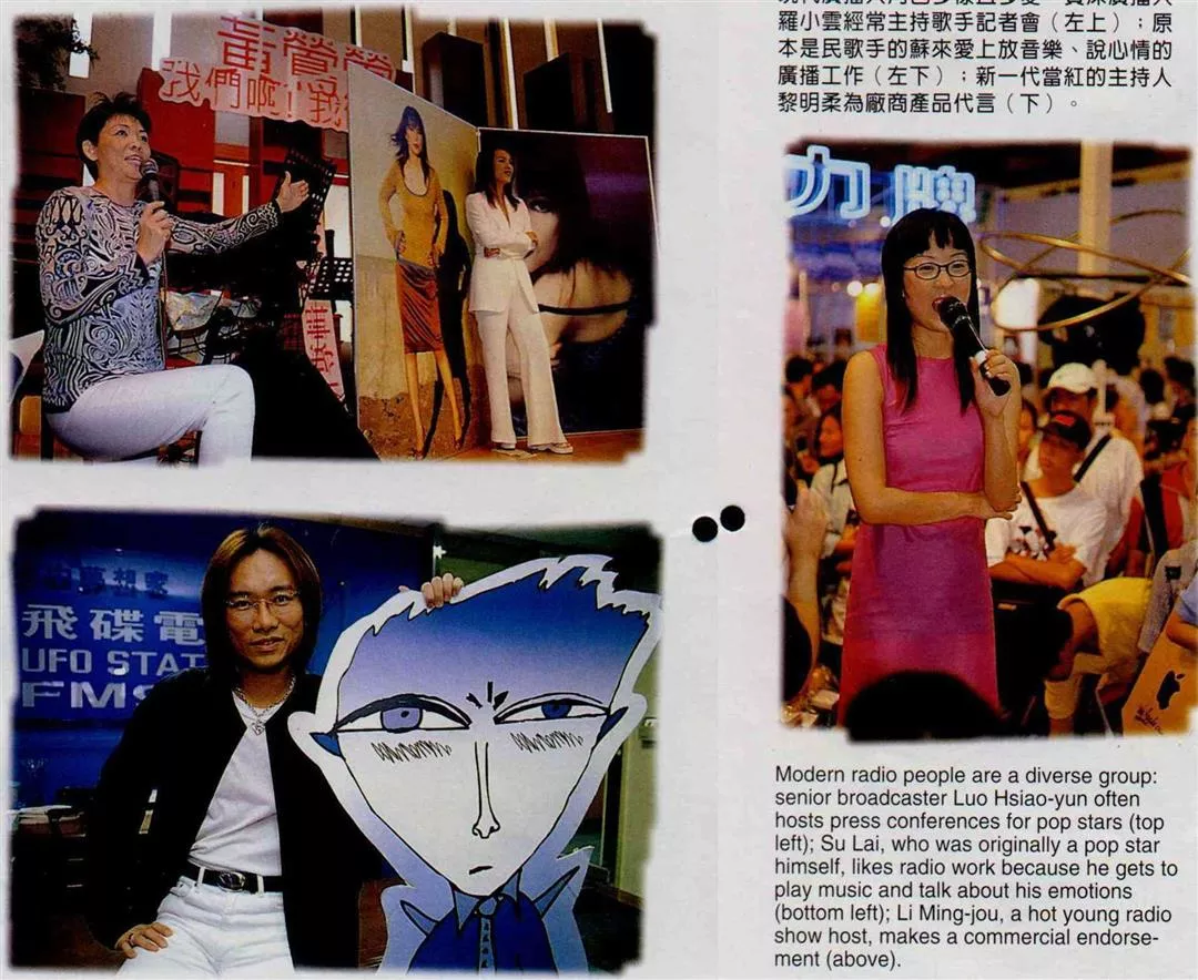 現代廣播人角色多樣且多變:資深廣播人羅小雲經常主持歌手記者會(左上);原本是民歌手的蘇來愛上放音樂、說心情的廣播工作(左下);新一代當紅的主持人黎明柔為廠商產品代言(下)。