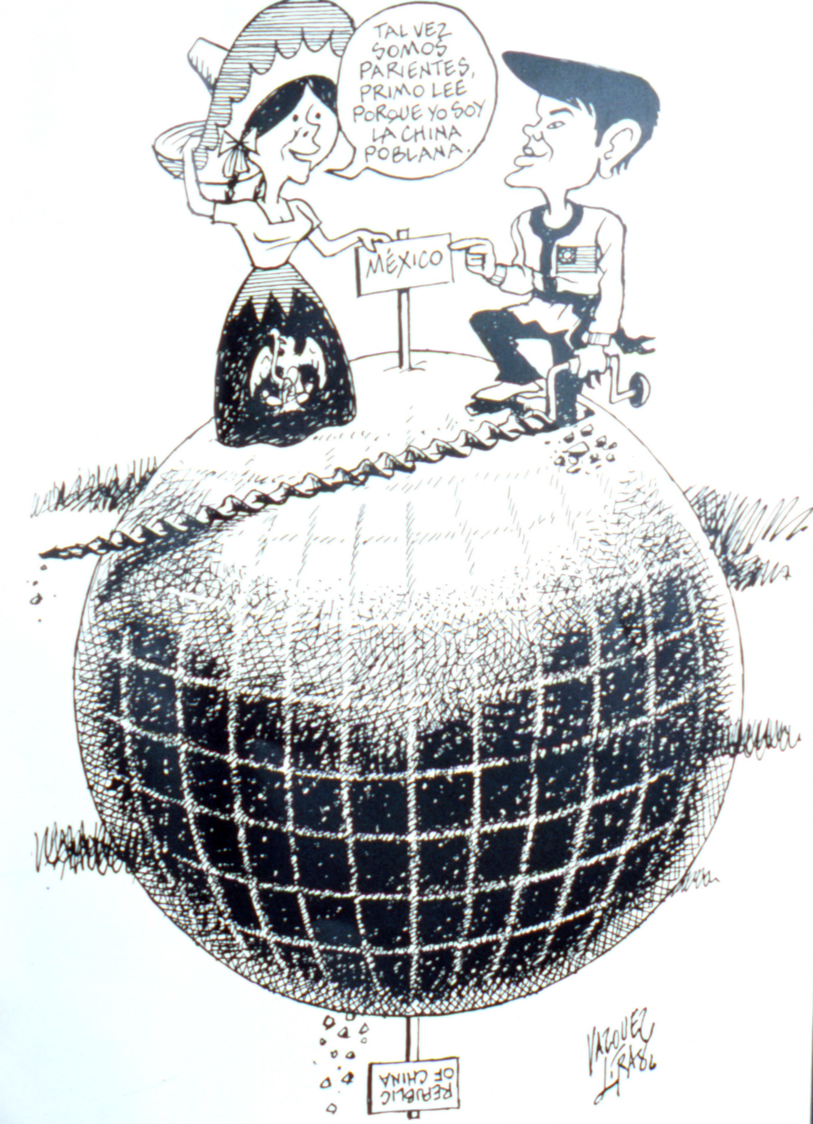 曾當選西班牙最佳漫畫家的薩拉斯,在他這次得到第二名的作品中,畫出「李表哥」意氣風發地用腳踏車載著「李表妹」,乘風前進;一旁,愁容滿面的鄧小平坐在無輪的駕駛台上,前進不得。