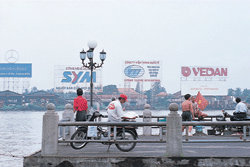 西貢江畔,當地居民遠眺台商味丹企業的大型廣告看板,顯示著西貢這個城市正在復甦中。