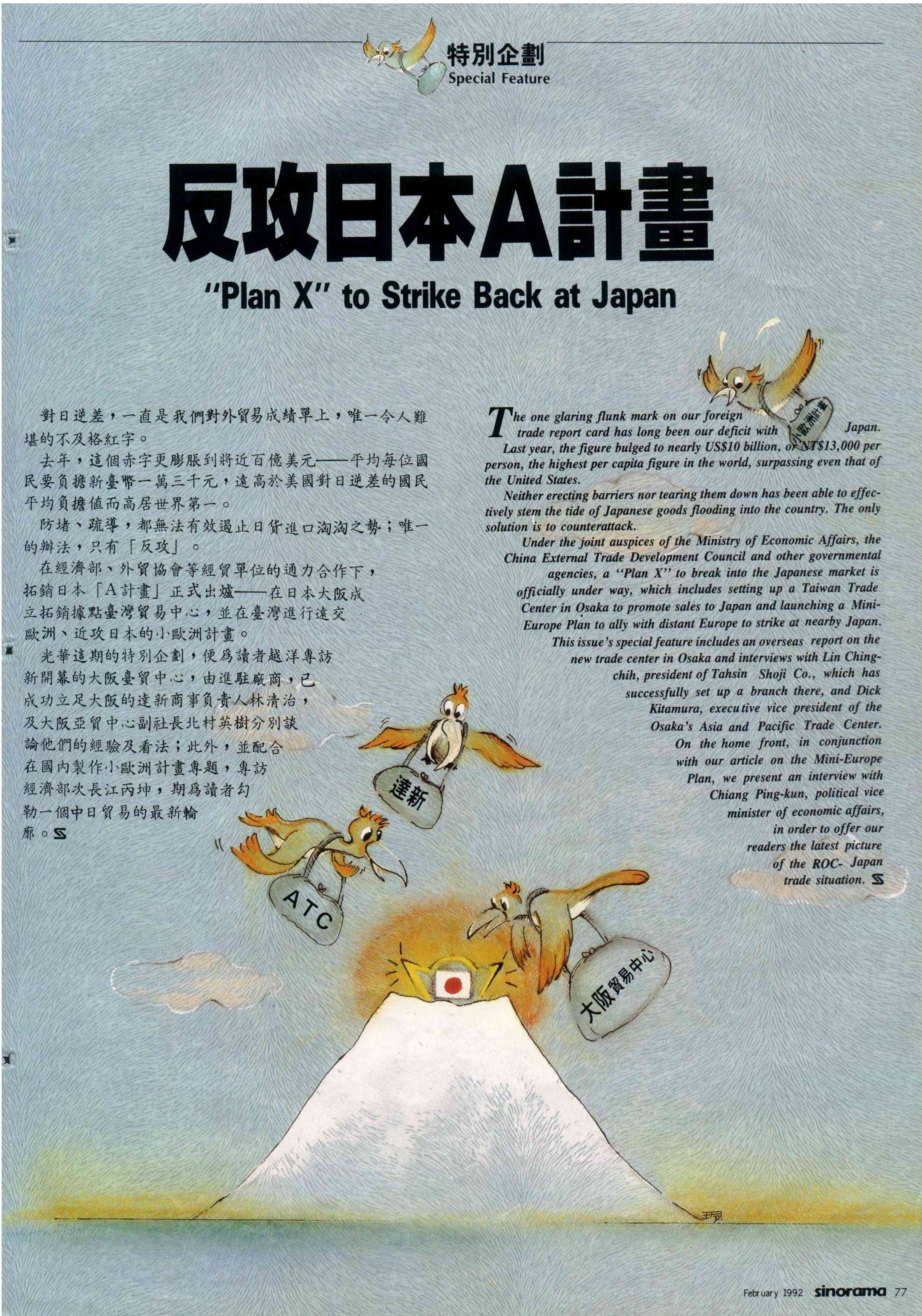 光華這期的特別企劃,便為讀者越洋專訪新開幕的大阪台貿中心,由進駐廠商,已成功立足大阪的達新商事負責人林清治,及大阪亞貿中心副社長北村英樹分別談論他們的經驗及看法;此外,並配合在國內製作小歐洲計畫專題,專訪經濟部次長江丙坤,期為讀者勾勒一個中日貿易的最新輪廓。