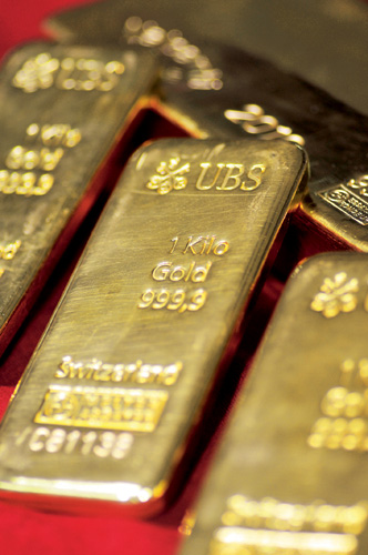 瑞士銀行(UBS)鑄造的黃金條塊國際知名,許多人喜歡買來儲蓄或投資。圖為台銀掛牌銷售的黃金條塊。