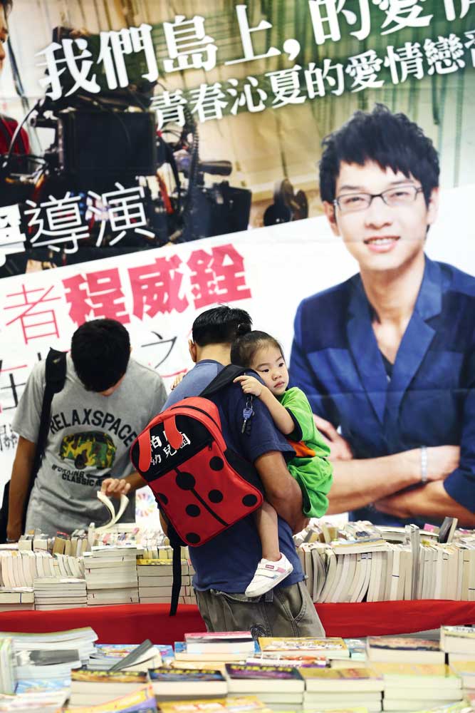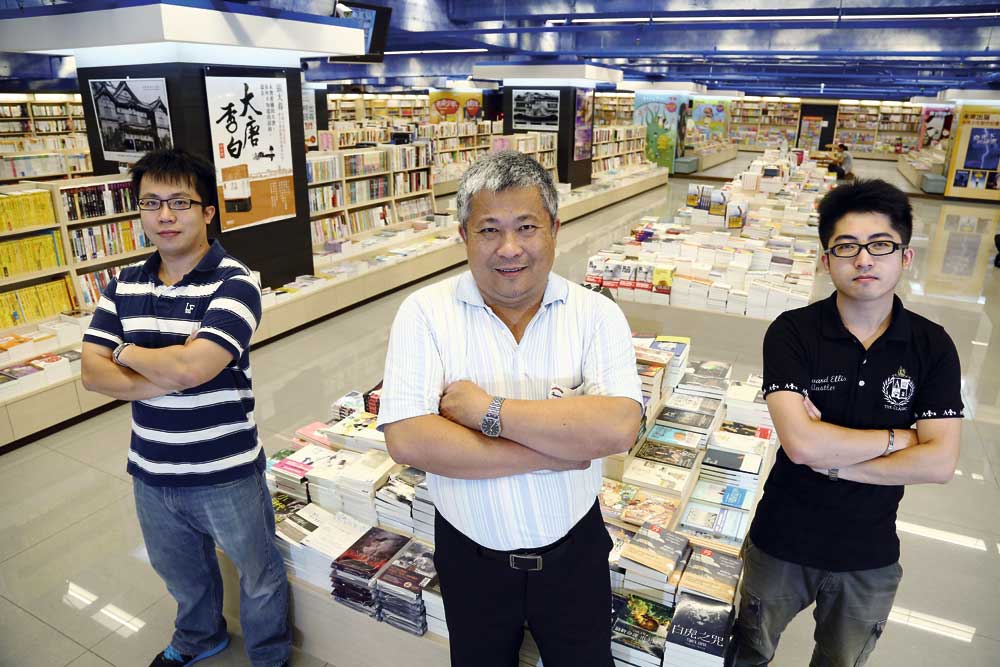 不畏景氣低迷,政大書城負責人李銘輝(中)與他的兒子,致力為出版業和愛書人打造一方書香園地。圖為今年7月新開幕的台南店。