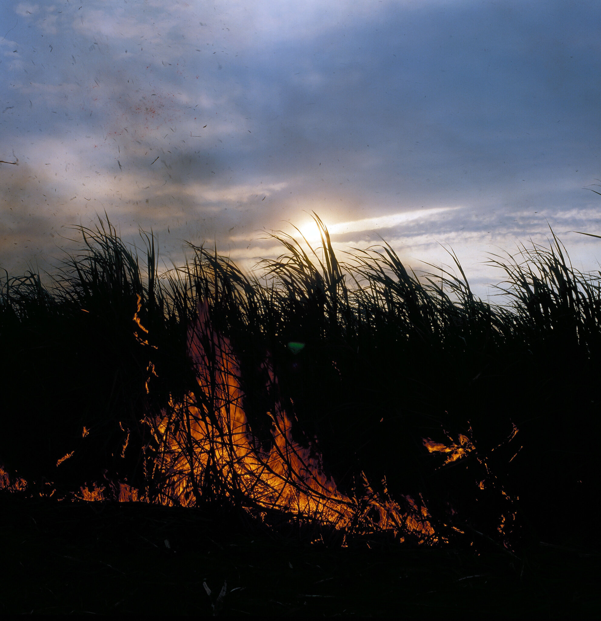 在更大片的蔗田裡,機器取代了人力的採收。在機器採收之前,先得放火燒掉枯乾的蔗葉。因此,在廣闊的平原上,到處都可看到一叢叢黑煙自蔗園裡升起,猛烈的火舌,幾分鐘內便吞噬了整片蔗田,噼噼啪啪的聲響,隨著騰空的烈焰,一路喧騰過去,像是過年的鞭炮聲似的,圍在田邊觀望的蔗農,忍不住要興奮起來。