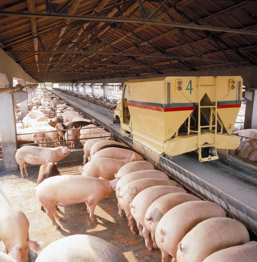 台糖公司的連鎖養豬事業,採科學化的經營方式,這是屏東六塊厝養豬場中,機械餵飼料的情形。