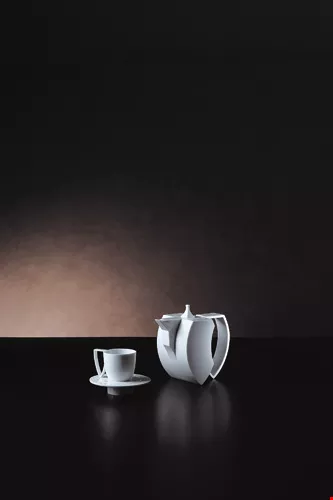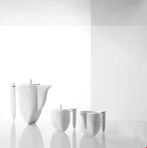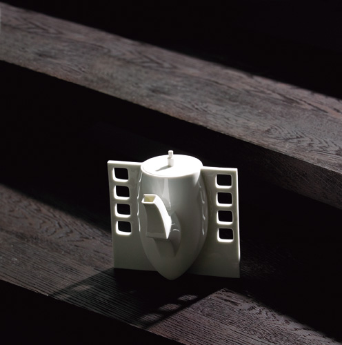 由蓋房子必須經過精密工程計算發想而來的《愛情建物》,兩組菱形交相融合,頂部是一道道鏤空圍欄。最特別的是這組茶壺沒有握把,倒茶時必須以手掌緊握菱形壺身,就像愛情得時時小心呵護。