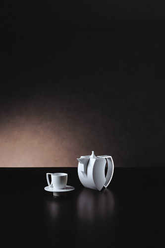 另一組名為《帝國記憶》的茶壺,靈感來自中國商周時期的酒器「尊」,茶壺中央腰身內縮,如綽約美女,左右支撐的把手90度頂天立地,姿態莊重、風範岸然,動靜對峙之間,格局磊落。杯具則設計成一片結實的提耳,神聖自在,碟子上的抬座,重複著簡潔的弧線,品茗時一口口尊貴的滋味,拔高的自信,自然渲染開來。