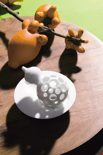 除了這些大氣作品,八方新氣也有些可愛的小玩意,例如民間廟宇執掌神明旨意的兩瓣「筊杯」,成為餐桌上的鹽罐和胡椒罐;以及圓型糖果盒、葫蘆造型的筆筒等。