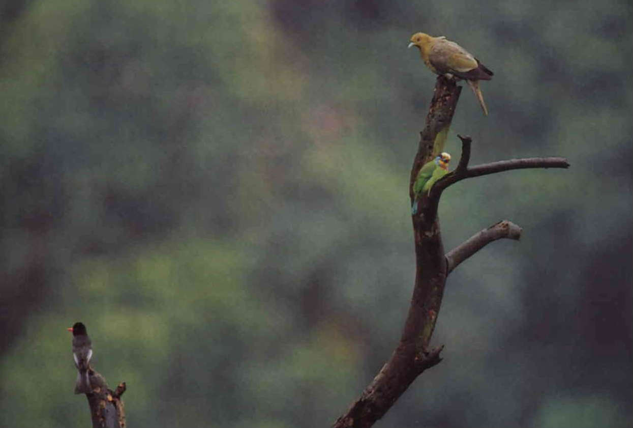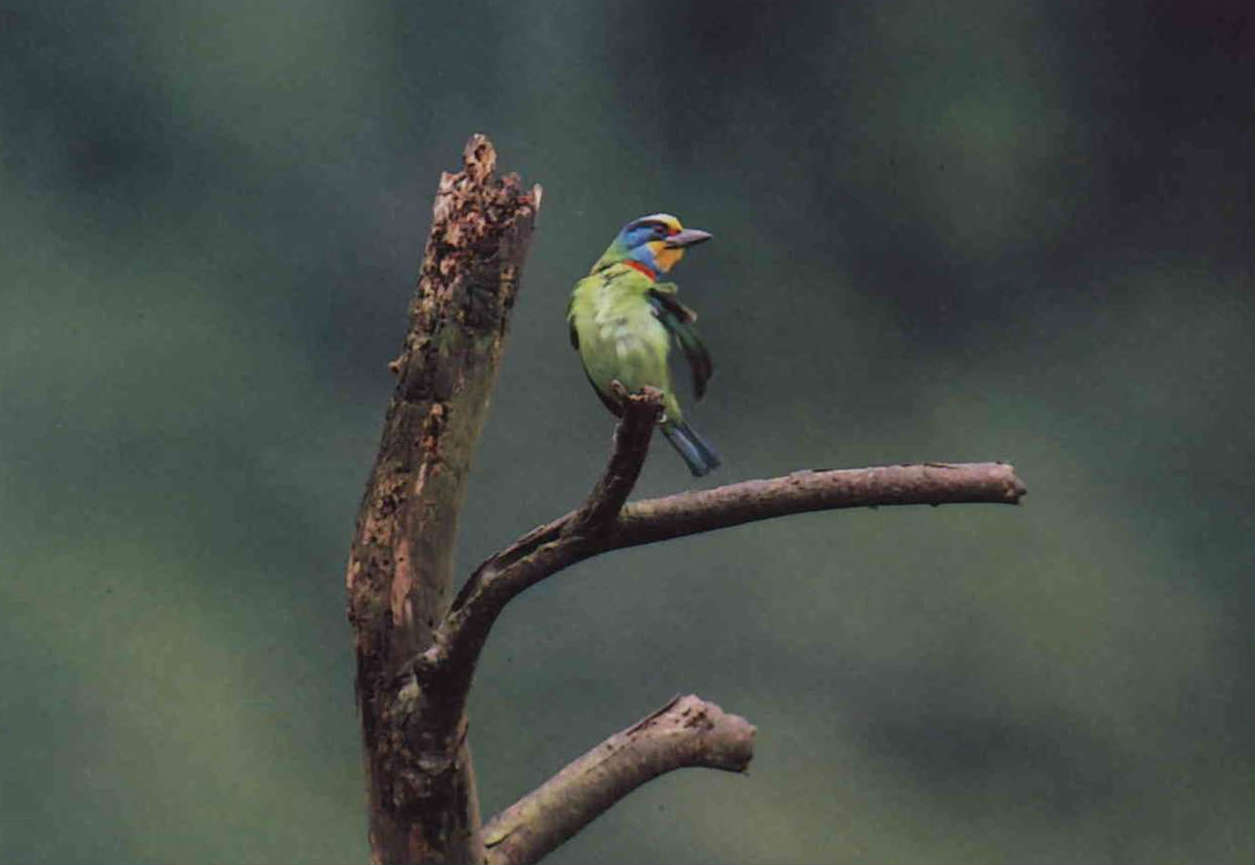 五色鳥: 五色鳥科的鳥類和啄木鳥科一樣,喜歡住在乾燥而通風的地方,常在枯木上打洞築巢。 在台灣原始闊葉林中,五色鳥集紅、黃、藍、黑、綠於一「頭」,加上翠綠色的身體,是最好的迷彩裝配,不易被發現蹤跡。但郊外常可以聽到牠們「扣!扣!扣!」敲木魚般的叫聲,從每年三月生殖季節到六、七月,「一夫一妻」的五色鳥更是一前一後不停搭唱應和。 (郭智勇)