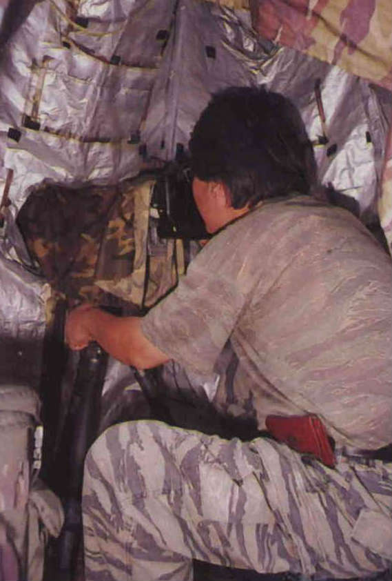 為免干擾鳥兒,賞鳥人設法將自己化為無形。迷彩帳是隱藏的好工具,圖為生態攝影者陳之心在悶熱的帳篷內「偷窺」, 好不容易「瞇」到了互相唱和的紅山椒鳥(右上,陳之心攝)、與顧盼無人的五色鳥(右下)。(郭智勇)