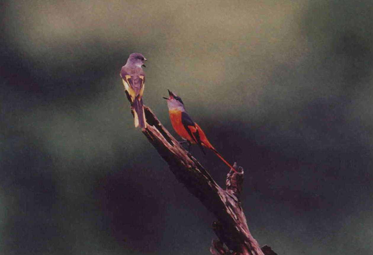 紅山椒鳥:在台灣中低海拔森林中,常可以看到紅山椒鳥像「蜂鳥」般定點鼓翼飛啄枝葉上的昆蟲。牠們身長十八公分左右,遠看就像掛在樹梢上的細長辣椒,雄鳥肚子至尾巴是橙紅色,雌鳥則是鮮黃色,雌雄顏色不同,卻一樣鮮豔美麗,過去常因此被大量捕捉販售,在被列入保育名單後雖有所改善,台灣中低山區的過度開發卻成為牠們新的威脅。(郭智勇)