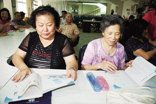 蔡家村的松年大學,已開設了編織(左)、日語班(右)及北管鑼鼓陣等才藝課程。
