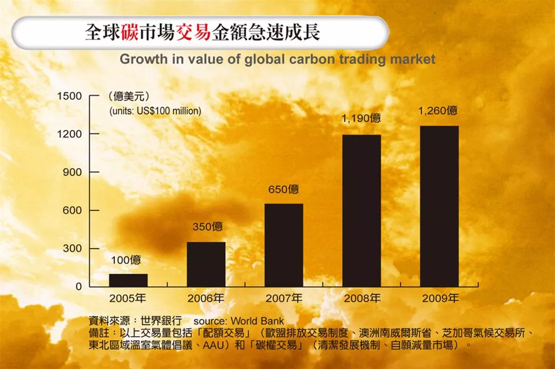 「碳交易市場的發展非常快速,」參與我國環保署規劃台灣碳交易制度的台北大學自然資源與環境管理研究所助理教授李堅明表示,全球碳市場規模一路飆升,由2005 年的100億美元增加至2009年的1,260億美元(右表);二氧化碳的交易量也從2005年3.5億噸「當量」(各種溫室氣體換算成CO2 的量)增加到73億噸當量。