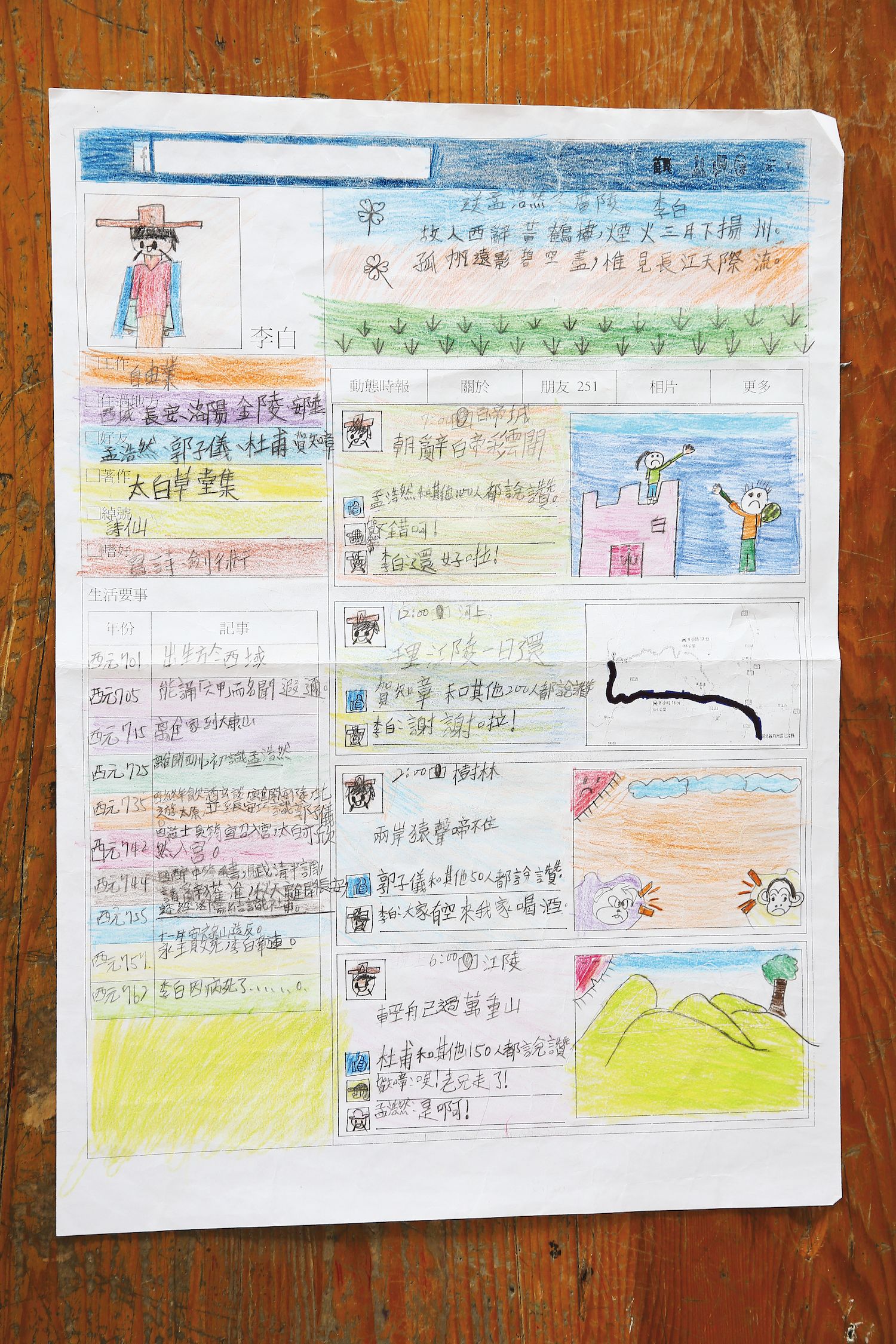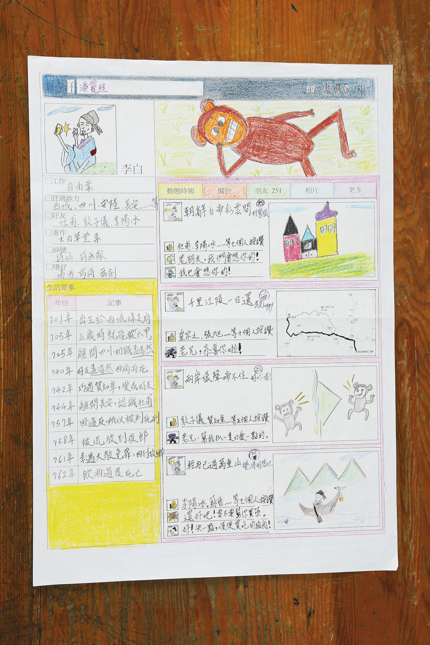 「你們現在吃飯、出去玩也是在發臉書動態,唐朝又沒有臉書,他們只好用自己的方式來記錄生活。」陳維士老師一邊說明,一邊拿出他準備好的臉書表格,「想像一下,如果李白有臉書的話,他會怎麼玩?」陳維士話說完,學生們一開始還瞪大眼睛不知道該如何動筆,但沒過多久就進入狀況,一張張李白的臉書陸續出現,課堂上也充斥著歡笑聲。