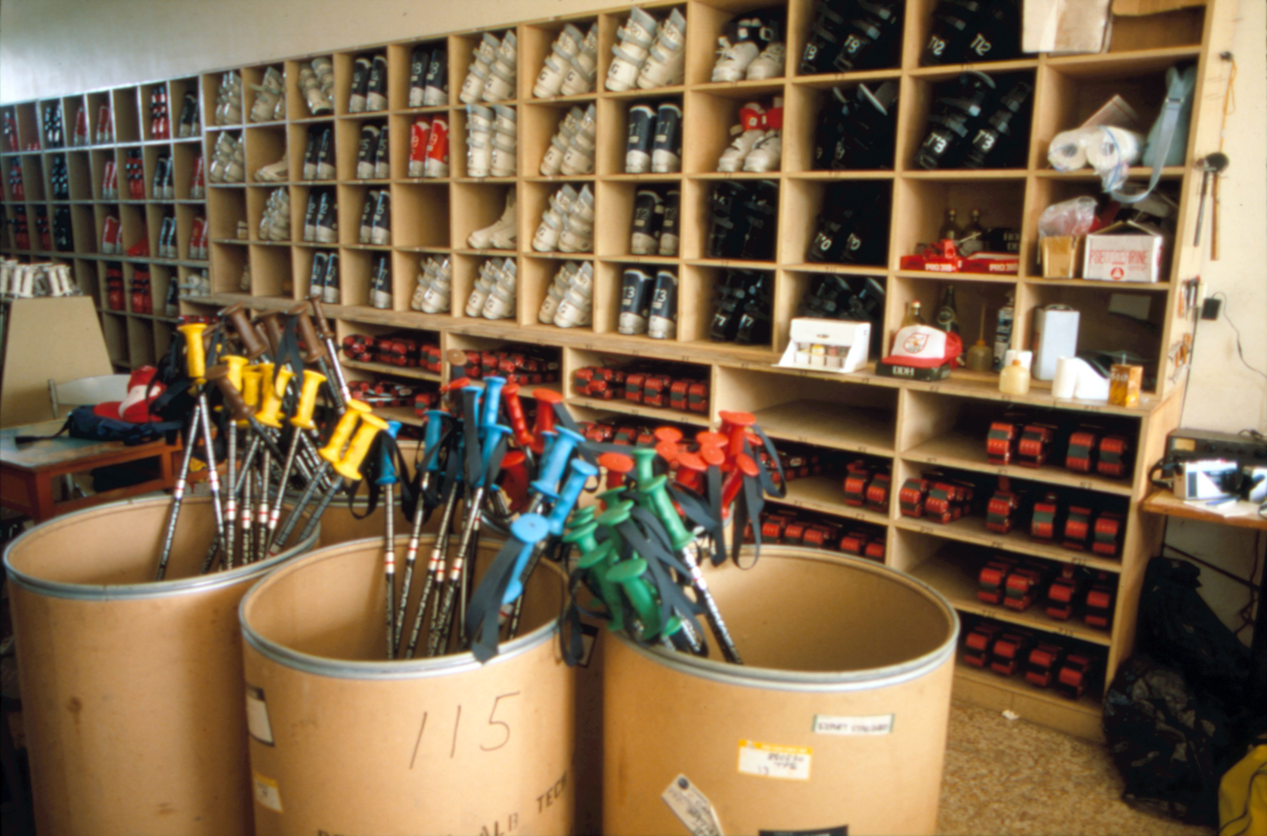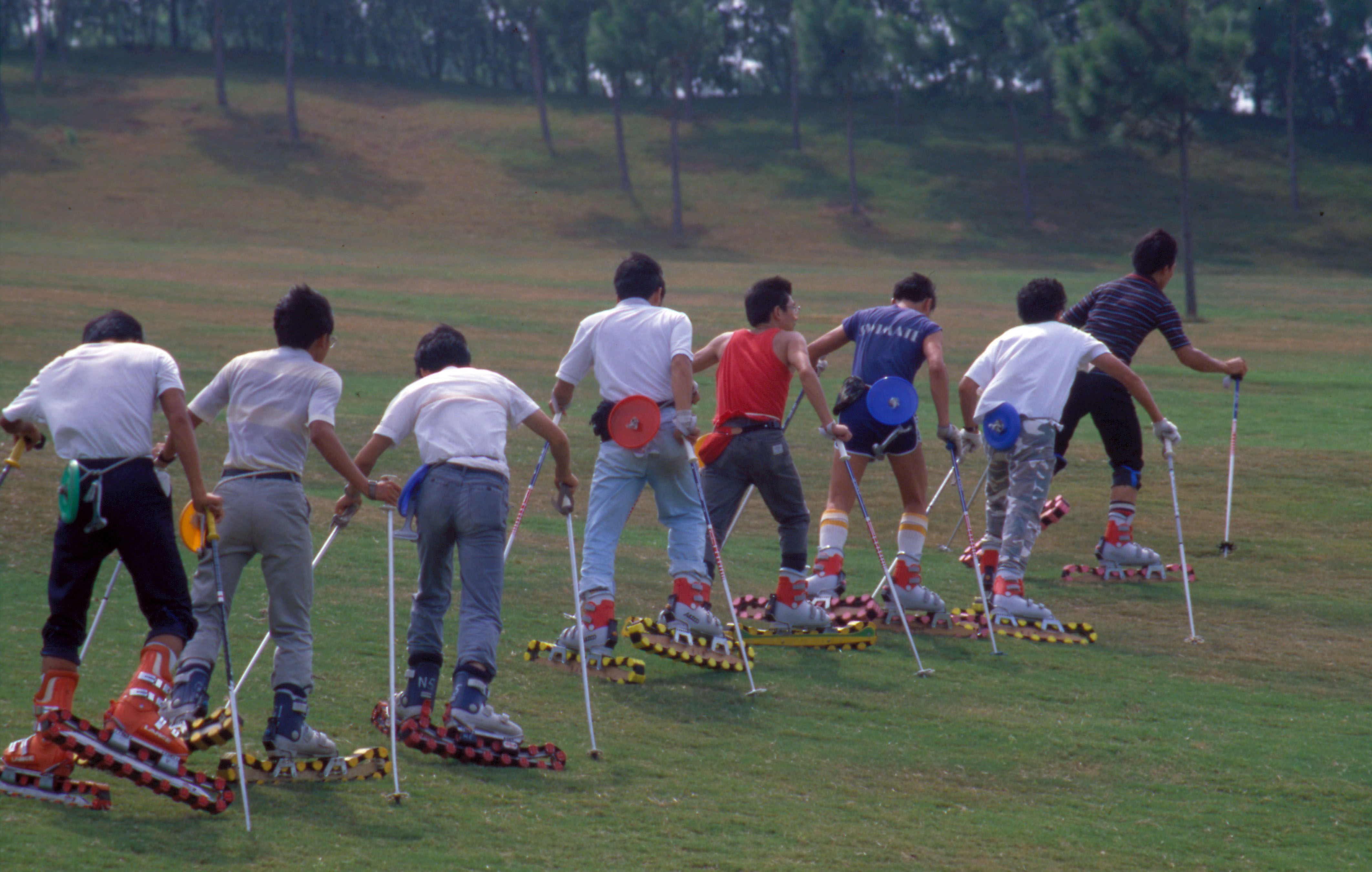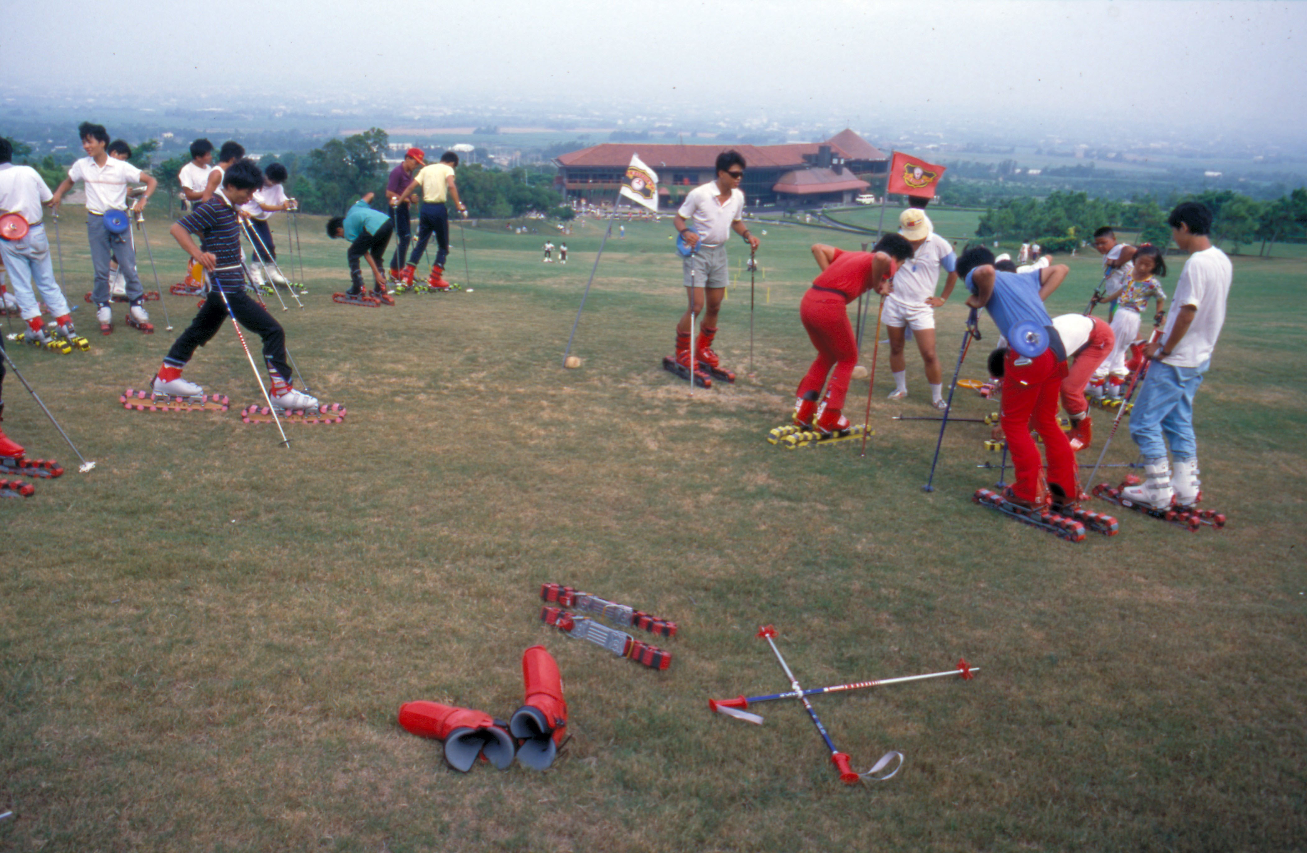 學會穿鞋後,才進入正式課程。第一章:學走路,要一步一杖,用腳帶動滑草器。滑草器比平常穿的皮鞋大上三分之一,要先學會運用自如——往上爬(稱為開腳登)、斜爬(稱為斜登、階登)。