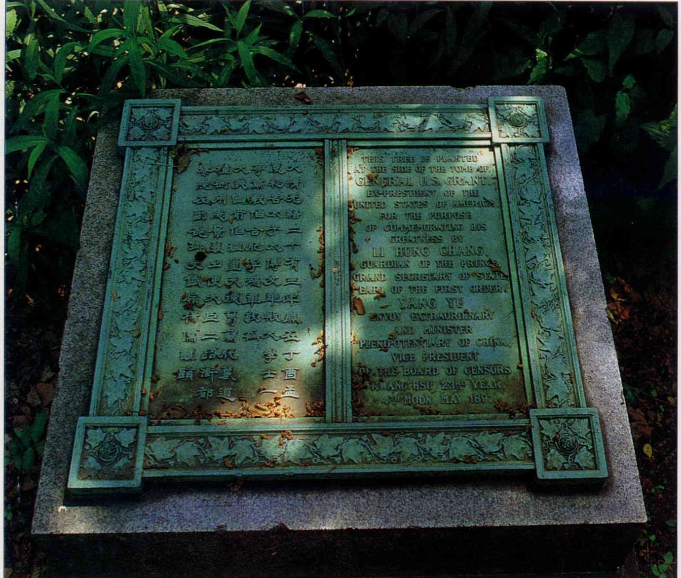 哥大有關中國的三景之一。這碑文之後,有二棵樹為清末名臣李鴻章親手所植。(卜華志)