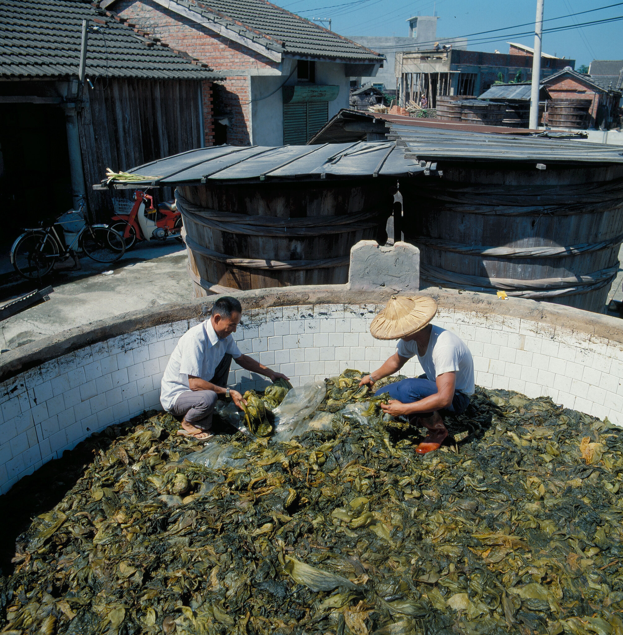 醃製酸菜所用的傳統木桶,都是檜木板製成的,造價極昂,每具在新台幣六萬元以上。但因醃製酸菜時使用大量的鹽,木材不易蛀腐,可以用上四、五十年之久,所以仍很合算。最近幾年來,也有人以水泥桶取代木桶,雖然造價低很多,但因它不能耐鹽的侵蝕,壽命短,所以不普遍。