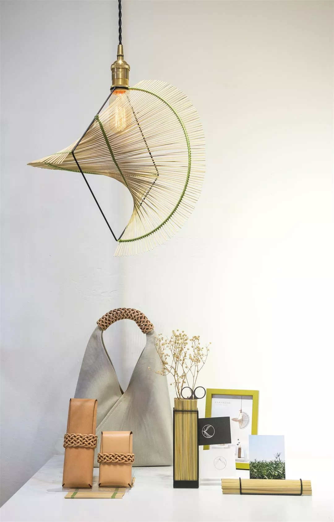 劉立祥說:「住在部落裡,每天看山、看海,不知不覺就做出很像海浪的形狀,(浪草燈)每個角度都不一樣,很像海浪的波濤,帶有韻律感。」用一個菱形加上兩個半圓,簡單幾何圖形組合,浪草燈的設計簡約且摩登,輪傘草吸收了花東的陽光,佐以扭轉出的海浪形狀,是一件蘊含滿滿花東自然的設計。其他以輪傘草發展出的旋草燈、名片座、置物格等品項,同樣以簡約風格,妝點桌上風景。