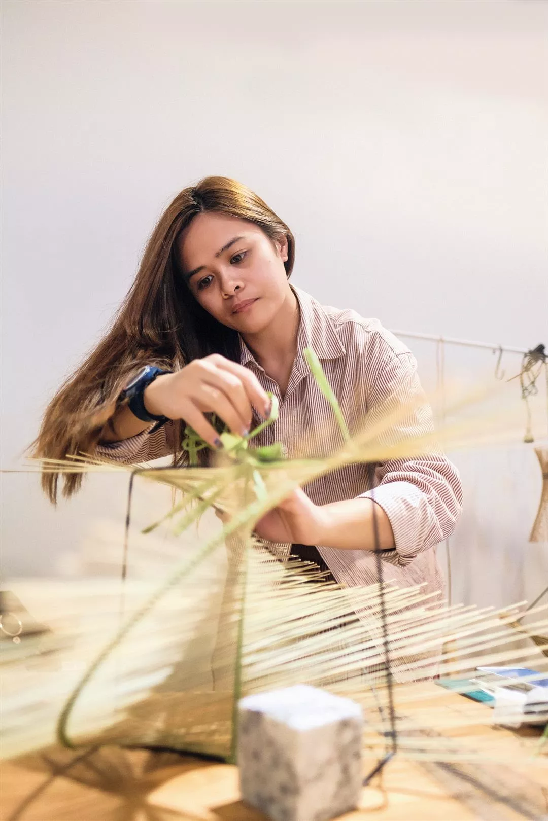 幾經嘗試,舒米才從阿美族取藤皮的方式獲得靈感,只取輪傘草莖的皮,把中間輸送水分的維管束削除,再經陽光曝曬的輪傘草片,材質就會穩定很多。她也從耆老那邊學習阿美族的編織技巧,招集部落婦女一起加入編織的行列,傳續阿美族的編織技法。