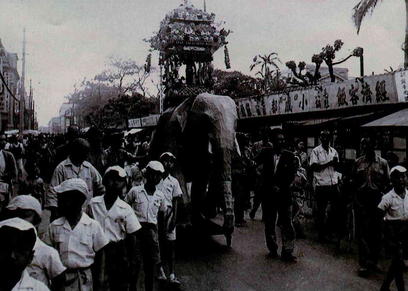 上)浴佛節遊行/台北新公園旁/1955。(張才)