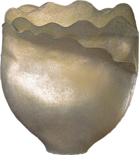 謝嘉亨研發黃銀色調的氧化銀時,由於晶體加水後變成強酸,會腐蝕噴槍的金屬噴嘴,後來改用塑膠噴嘴才克服腐蝕問題。此作品為花器。