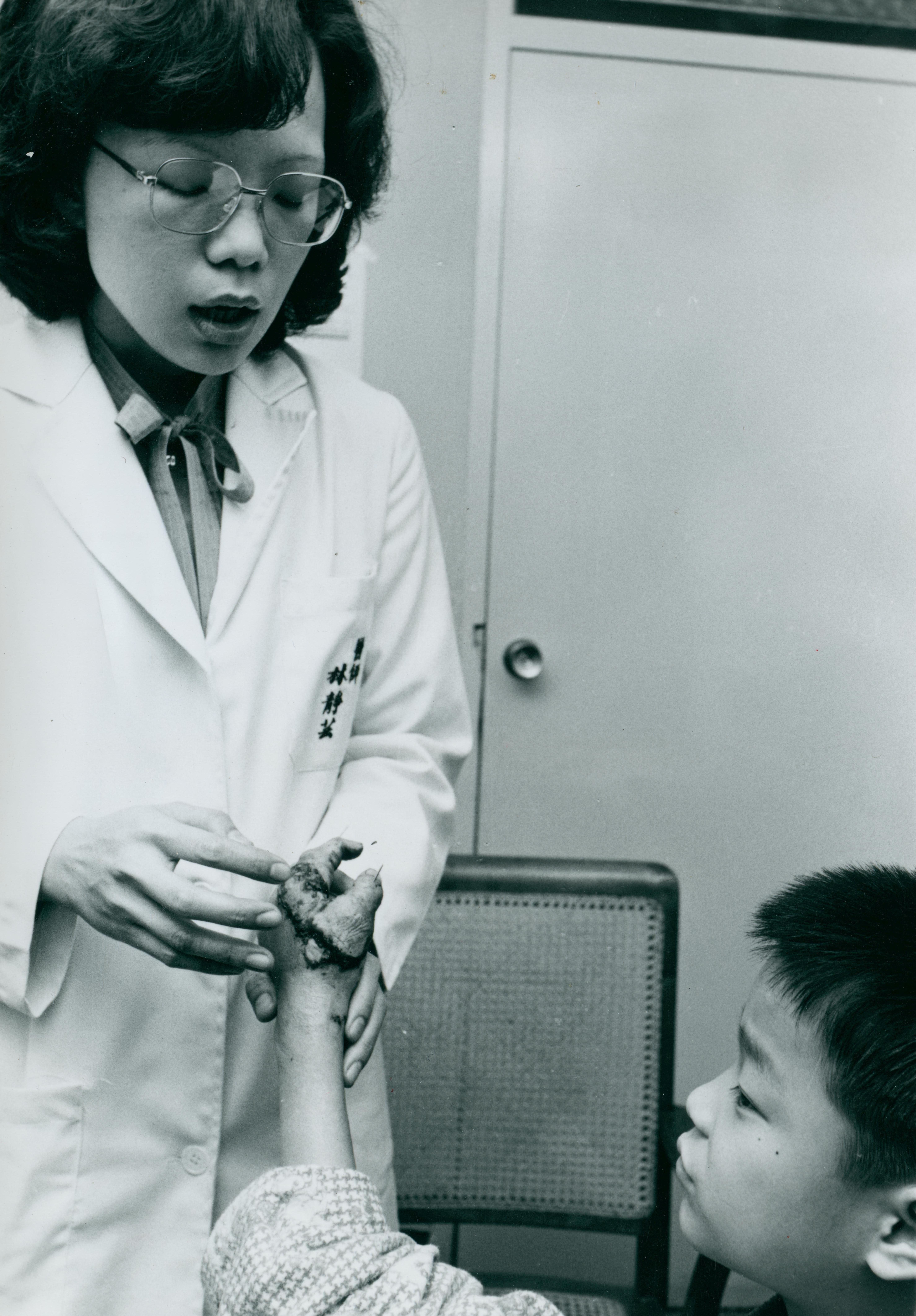 這位小病人家裏開工廠,他的拇指和食指不慎被機器削斷,經林靜芸為他施行顯微手術接續後,已近痊癒。(李影 文.姍姍)