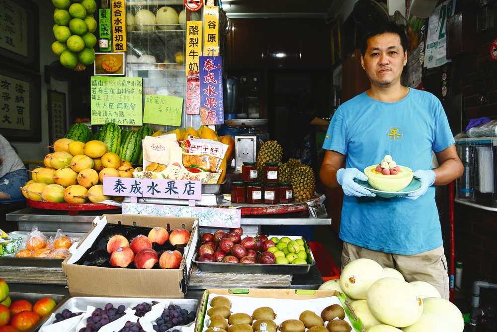 傳承三代的正興街老店鋪泰成水果店生意相當興隆,老闆郭泰成身穿「彩虹來了」為他設計的專屬T恤,足見店家彼此間的好感情。